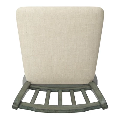 - Spindle back design and linen upholstered padded seat