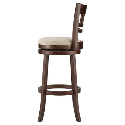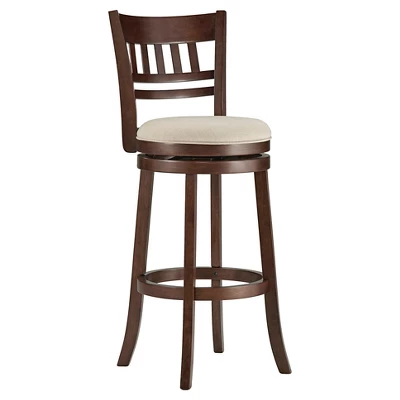Classic and sturdy the Wolcott Swivel Barstool has a timeless look that will add a rich pub-like feel to your basement bar or your great room bar-height counter. Crafted in a sturdy hardwood, this stool has all the classic features you are looking for such as: an open slatted back, a super comfortable padded seat, flared legs and a swivel base. A great way to add an update to your traditional or transitional decor style. Choose from 4 rich finish and upholstery combinations.