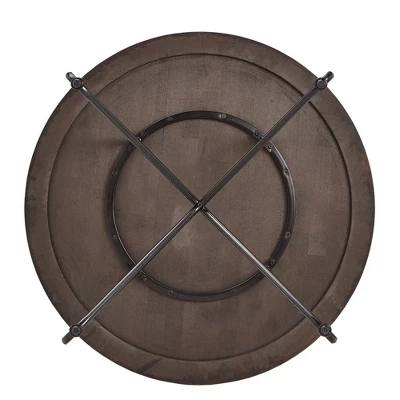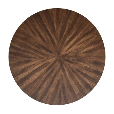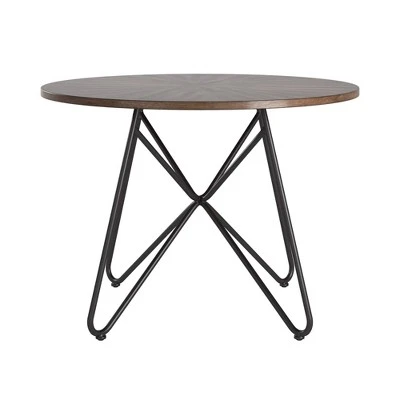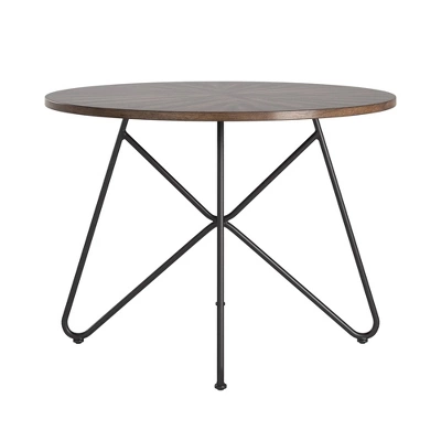 Simple yet transitional, the Leonard Walnut Finish Round Dining Table With Black Iron Legs from Inspire Q is perfect for your eat-in kitchen or casual dining setting. Gather your closest friends around the smooth, round table top for happy hour, game night, or Sunday brunch. An industrial look is created from the black iron pedestal-like base while the walnut finished table top offers some traditional charm for a beautiful contrast.