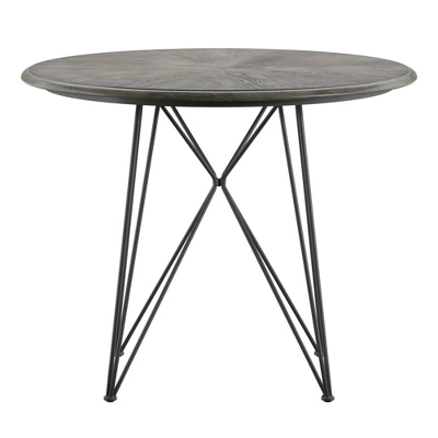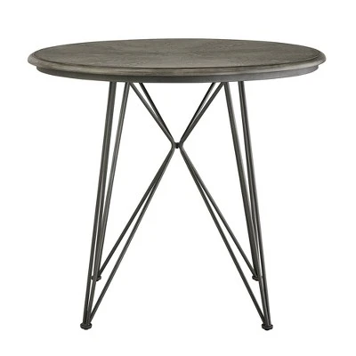 Modern and styled, the Nowell 42″W round iron table, establishes the ultimate industrial, rustic vibe for your casual dining space. Perfect for happy hours, the counter height table features a black powder coated metal frame that makes up the intricately woven, and the pedestal table base. The dense table top is constructed of a gray wood, giving off a weathered vibe that pairs well in neutral themed spaces. With the addition of foot rests, this durable table provides improved comfort for everyday use.
