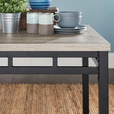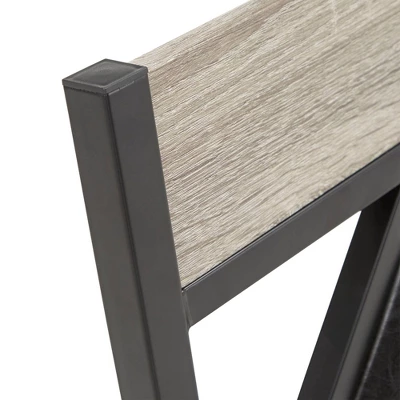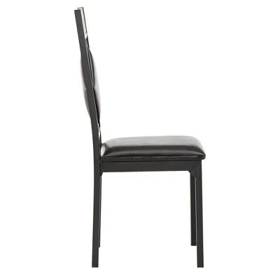 Perfect for compact spaces or hang out areas of the home, this black finish 5-piece dinette set brings function and unique style to any room. A sleek, black powder coated metal frame contrasts with a light, MDF table top and chair accents to display a subtle, industrial vibe. These chairs offer up an inviting and comfortable spot for family and friends to sit with their black, faux leather seat cushions and matching diamond shaped chair backs. Place this set in an intimate nook of your home for sophisticated and charming fashion that’s sure to leave a lasting impression.