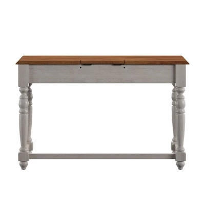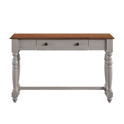 The Ivalyn 1-drawer Desk with Charging Station from Inspire Q establishes a beautiful farmhouse aesthetic in your home office. Proudly boasting a two-tone finish, this simple desk comes in a variety of antique colors, all of which feature a visible wood grain for that classic countryside feel. This chic desk comes with one drawer to store writing essentials and a power and USB outlet built into the top for your convenience. A solid rubber wood construction ensures resiliency and stability for everyday use.