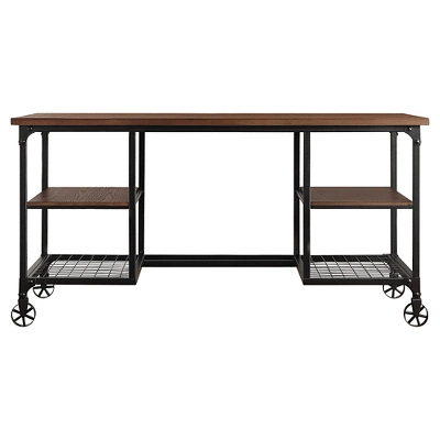 The Merida Mixed Material Writing Desk from Inspire Q offers industrial charm to any space. Tiered shelves underneath the spacious tabletop surface offer ample storage while stylish fixed wheels add a unique touch. with four shelves, this desk is the perfect addition to any home giving space to store all your books and papers. Warm cherry wood and black metal contrast dramatically for a statement that is sure to dazzle in any space and create an industrial vibe.