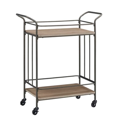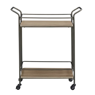 Entertain in timeless, transitional style with the Wilkin Bronze Finish and Wood Straight Lines Bar Cart from Inspire Q. This up-to-date bar cart features a clean-cut design with sleek lines and smooth surfaces. Framed with sturdy metal in a vintage-like bronze finish, this bar cart comes with two generous shelves, so you always have enough space for all your glasses and drinks. The addition of caster wheels on the bottom and handlebars on the top promise fluid mobility so you can entertain without a hitch.